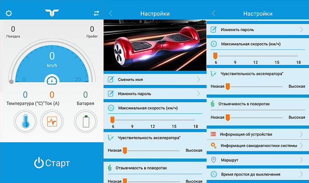 • Подключение к смартфону – мобильное приложение TaoTao, разработанное производителем материнских плат и контроллеров, позволяет осуществлять тонкую настройку гироскутера с помощью смартфона (доступно в AppStore и PlayMarket). Пользователь сможет менять чувствительность датчиков, ограничивать максимальную скорость, контролировать заряд батареи и т.д. (подробнее, см. ниже)